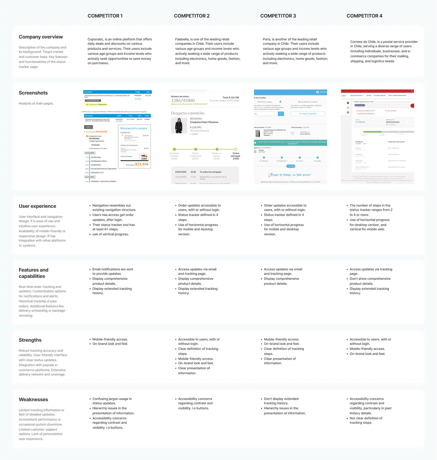 As part of my process and before jumping up on solutions, I used customer support feedback to understand what users’ pains were. It was a way to empathize with them and make connections with the possible solutions I worked on later. Also, I ran a competitive analysis of competitors in Chile to see what solutions they do, seek inspirations, key features, and identify patterns.