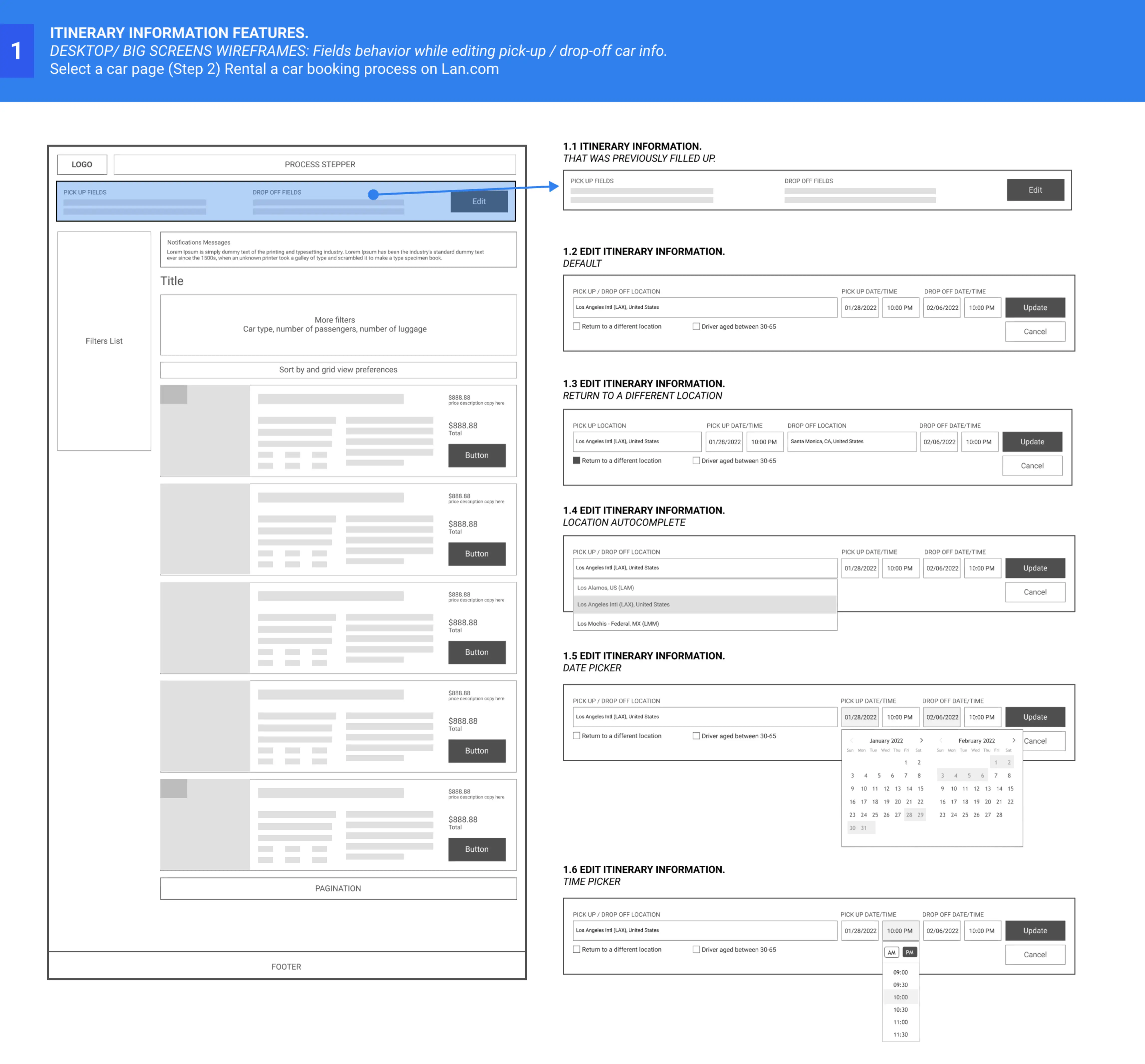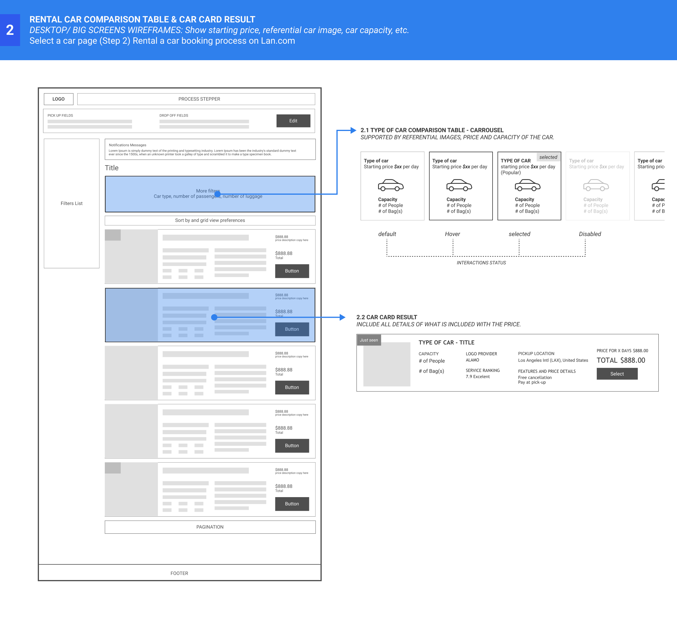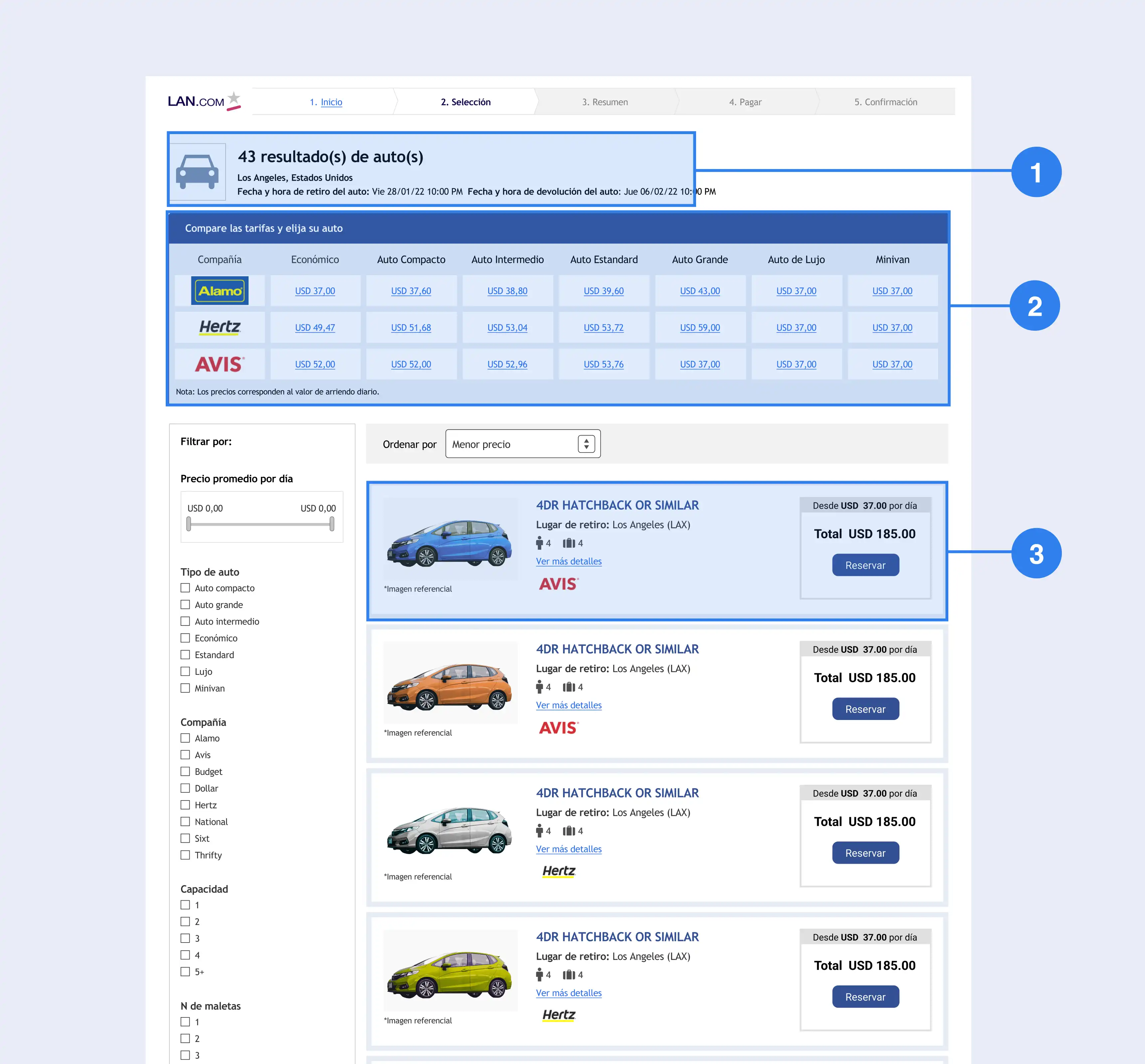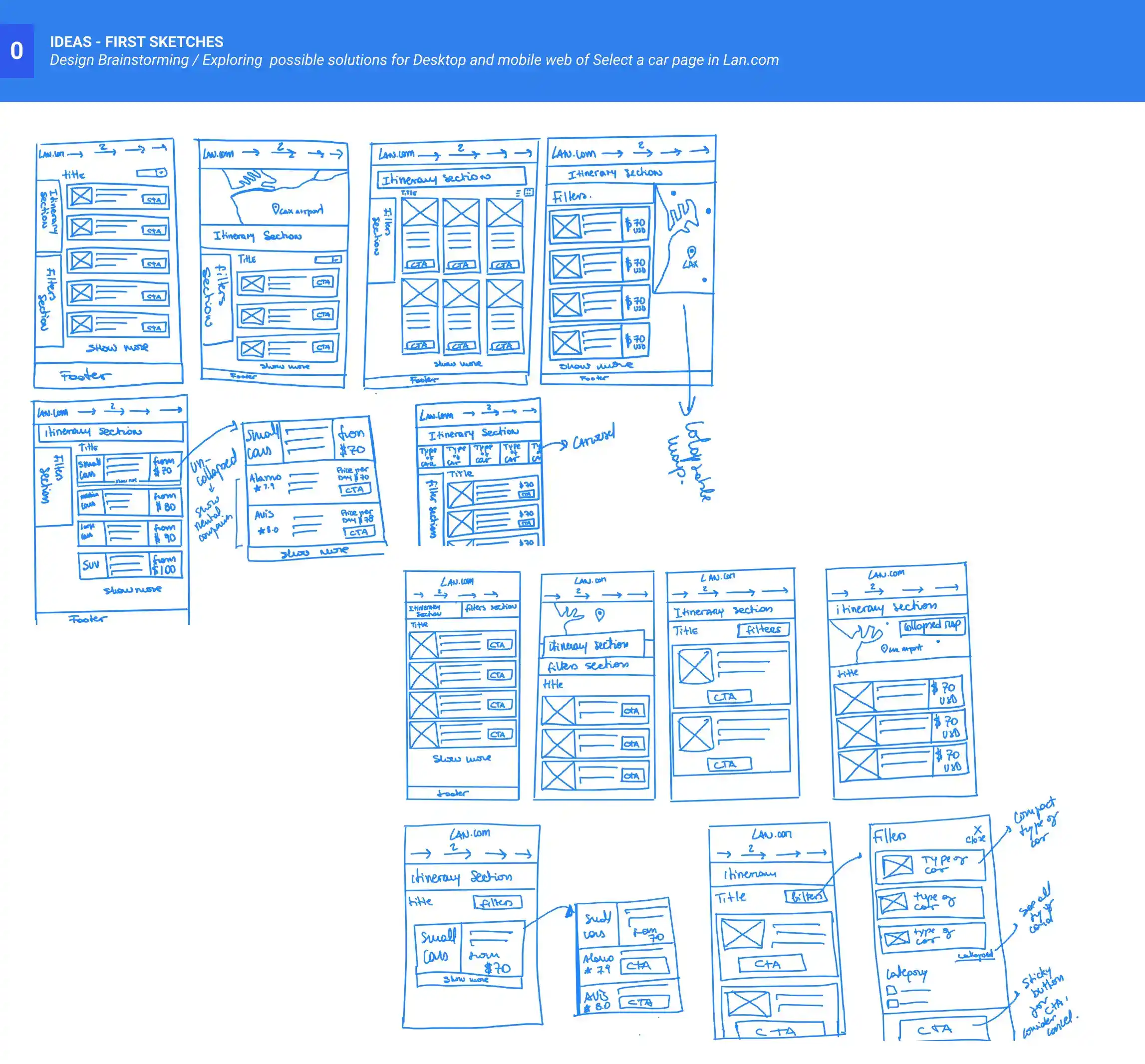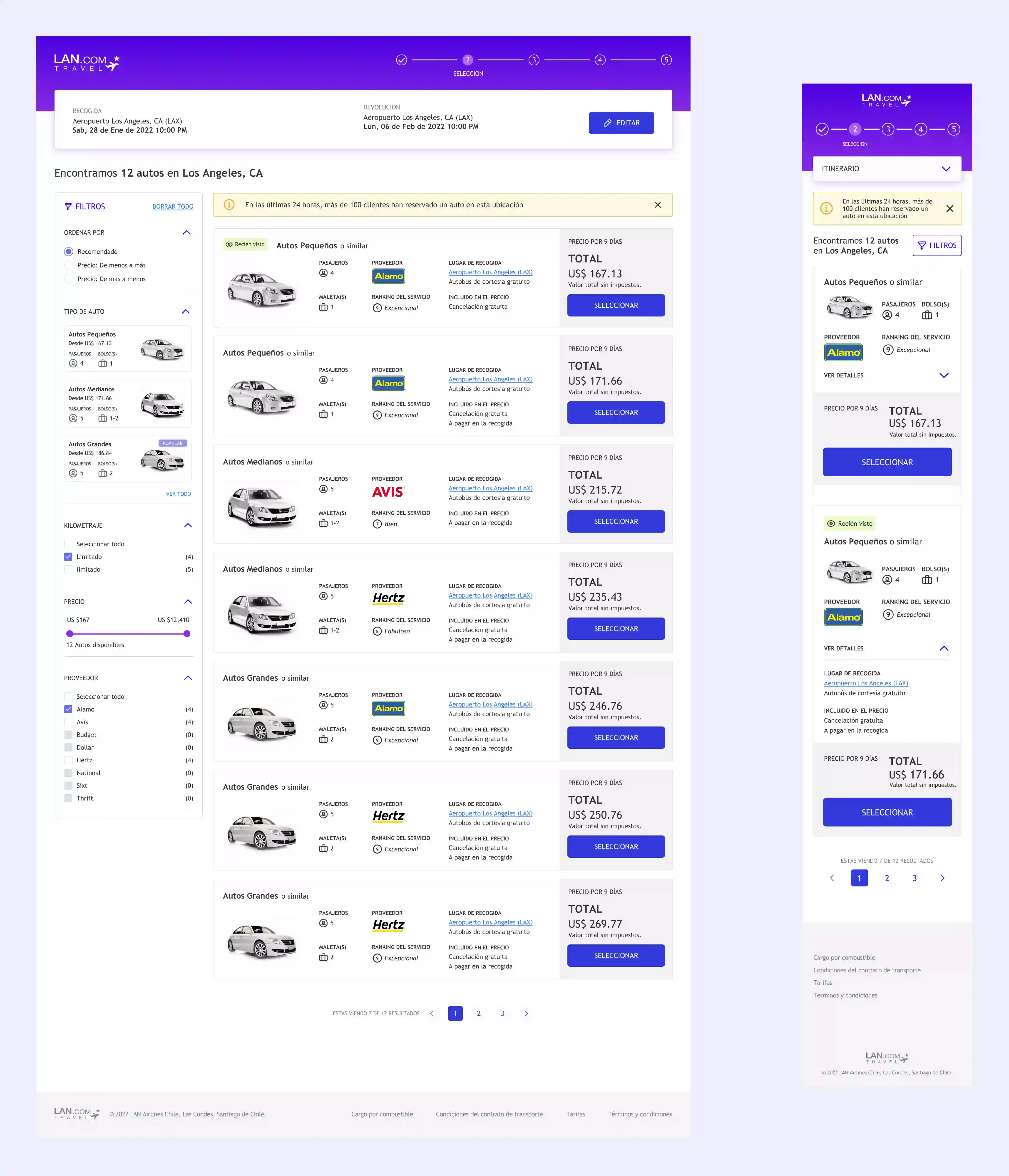 When I worked as a web designer in the design team at Lan.com (aka LATAM airlines), my role included making wireframes, improving user interactions, and implementing design mock-ups of different sections of Lan.com. One of the projects assigned to me was to redesign a part of the rental car booking process, precisely the search results page.